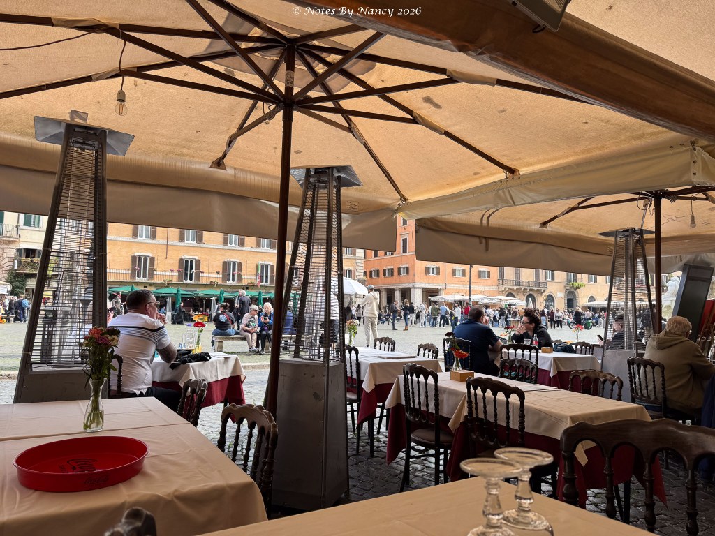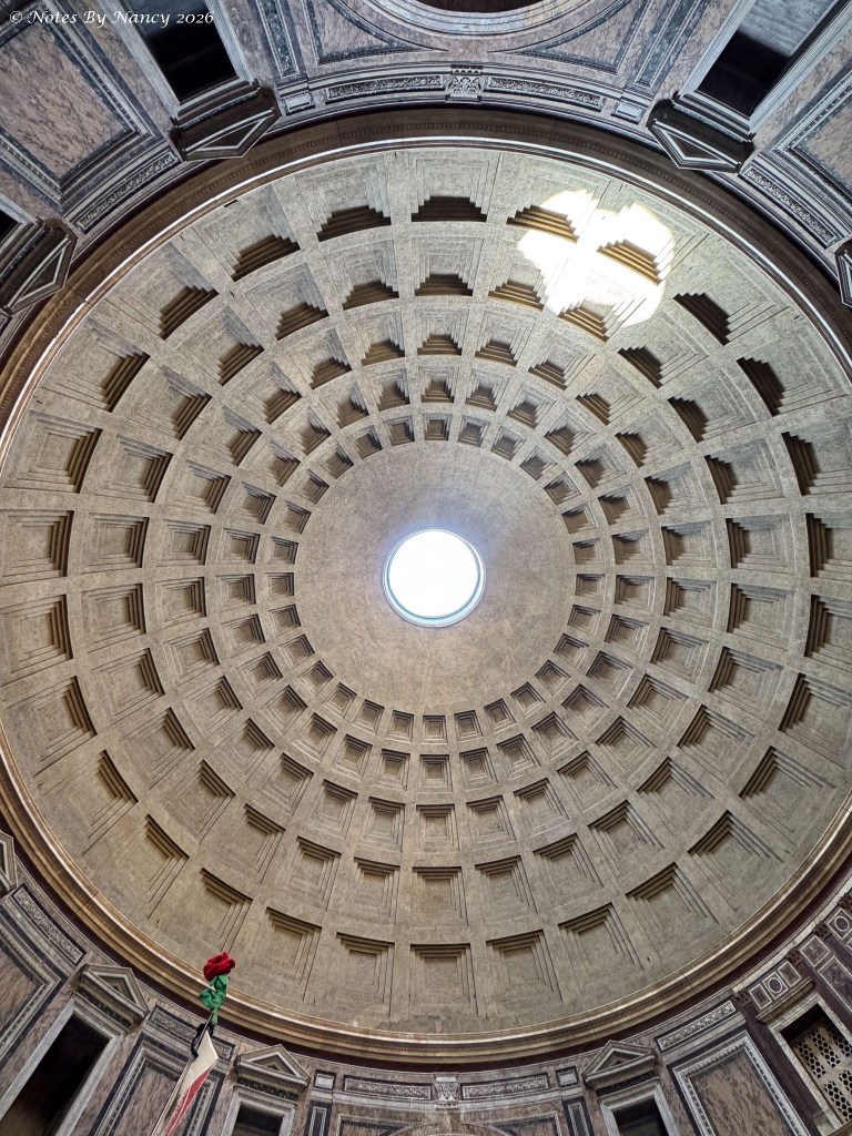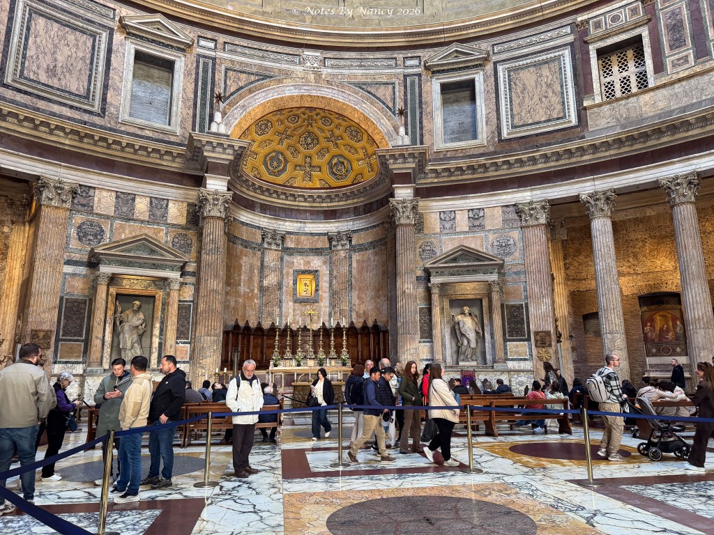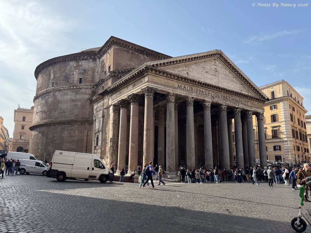As we maneuvered along the narrow alley dodging delivery vans and small cars, another piazza opened before us with the 2nd-century architectural wonder we were seeking looming beyond – The Pantheon. Tickets (5 Euros) are required and entries are timed.