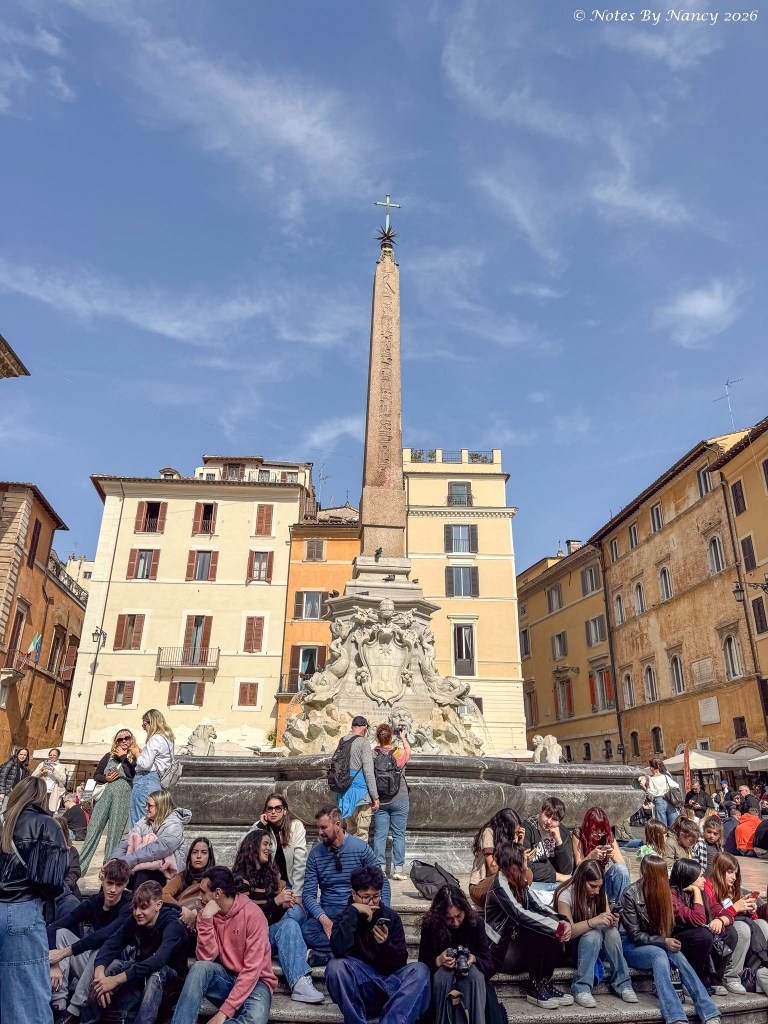 Back in the Piazza della Rotunda, tour groups, school groups, and general tourists enjoy the early March sunshine beside one of the 8 ancient Egyptian obelisks. Brought to Rome by Emperor Domitian, it was located in this vicinity in the Sanctuary of Isis. In 1711, it was placed here with the fountain and topped with a Christian cross and Pope Clement XI’s herald (star and mountains).