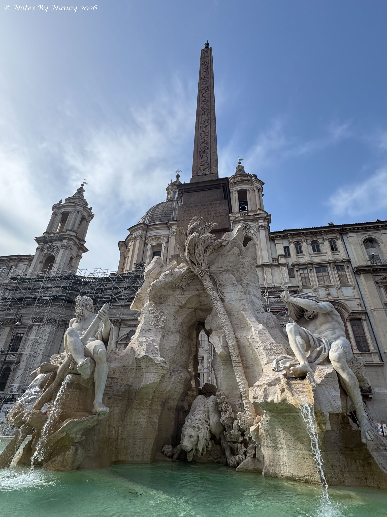 A few blocks away from the Pantheon, Noon bells were peeling as we stood in the Piazza Navona facing Sant’Agnese in Agone (also called Sant’Agnese in Piazza Navona). From Wikipedia: it is a 17th-century Baroque church in Rome, Italy. It faces onto the Piazza Navona, one of the main urban spaces in the historic center of the city and the site where the early Christian Saint Agnes was martyred in the ancient Stadium of Domitian aka Circus Agonalis.