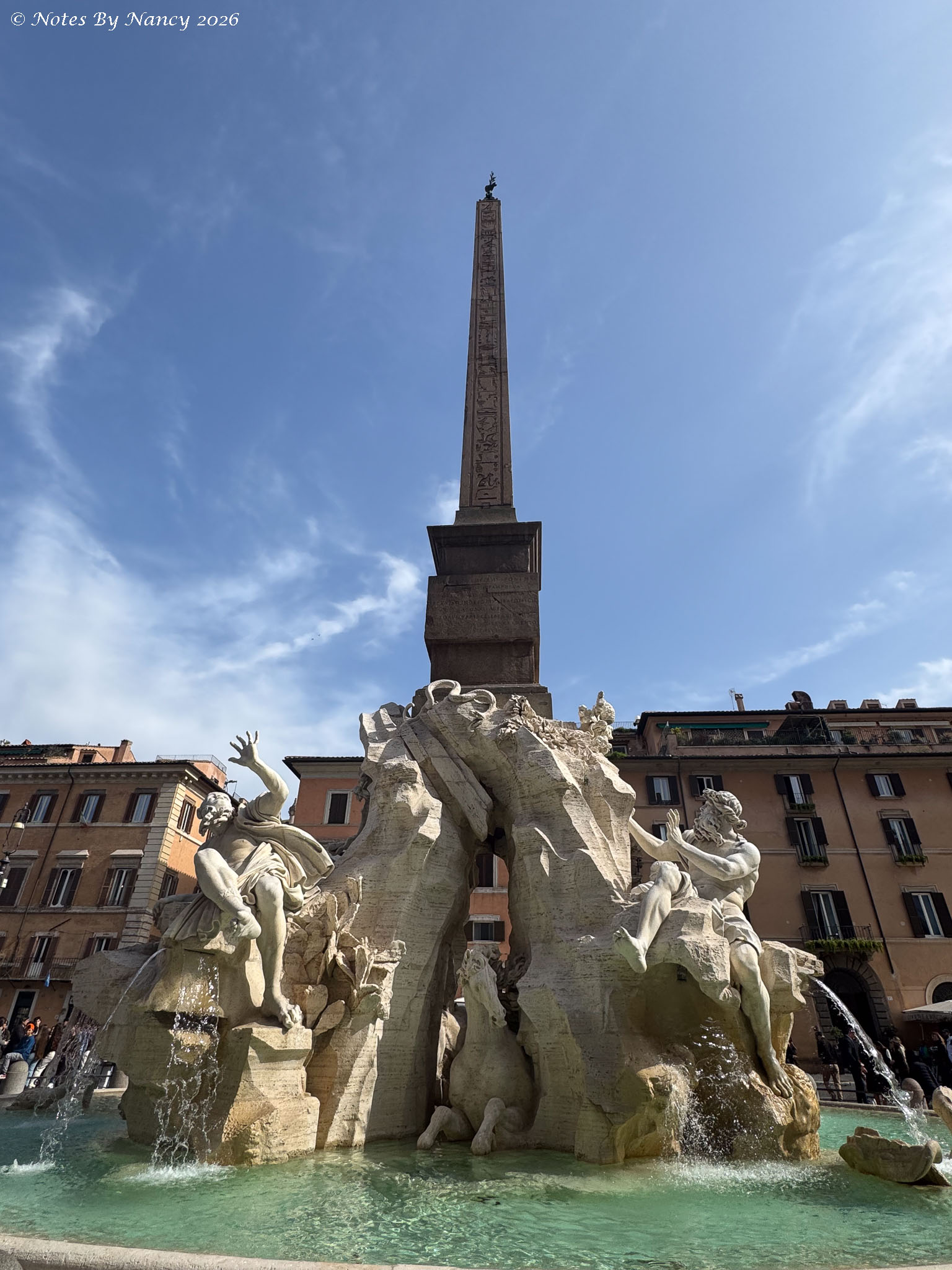 We returned to the Piazza Navona and examined another Bernini fountain – Fontana dei Quattro Fiumi (Fountain of the Four Rivers) from 1651. The four rivers are representative of the four continents under papal authority – the Nile (Africa), the Danube (Europe), the Ganges (Asia), and Río de la Plata (the Americas). This time we have a Roman copy of an Egyptian obelisk at the center. If you read or watched Dan Brown’s Angels & Demons – this and other Bernini works figure prominently in the story.