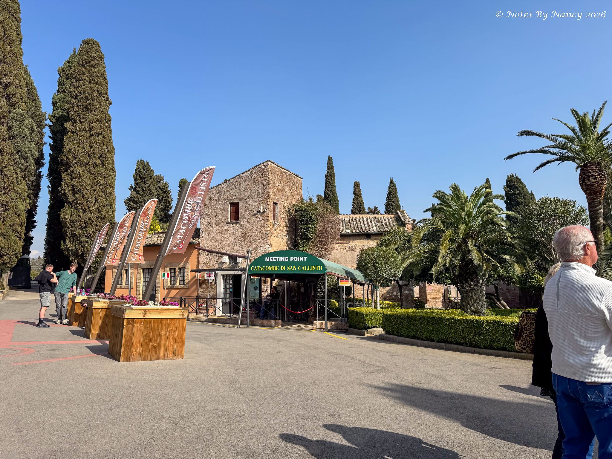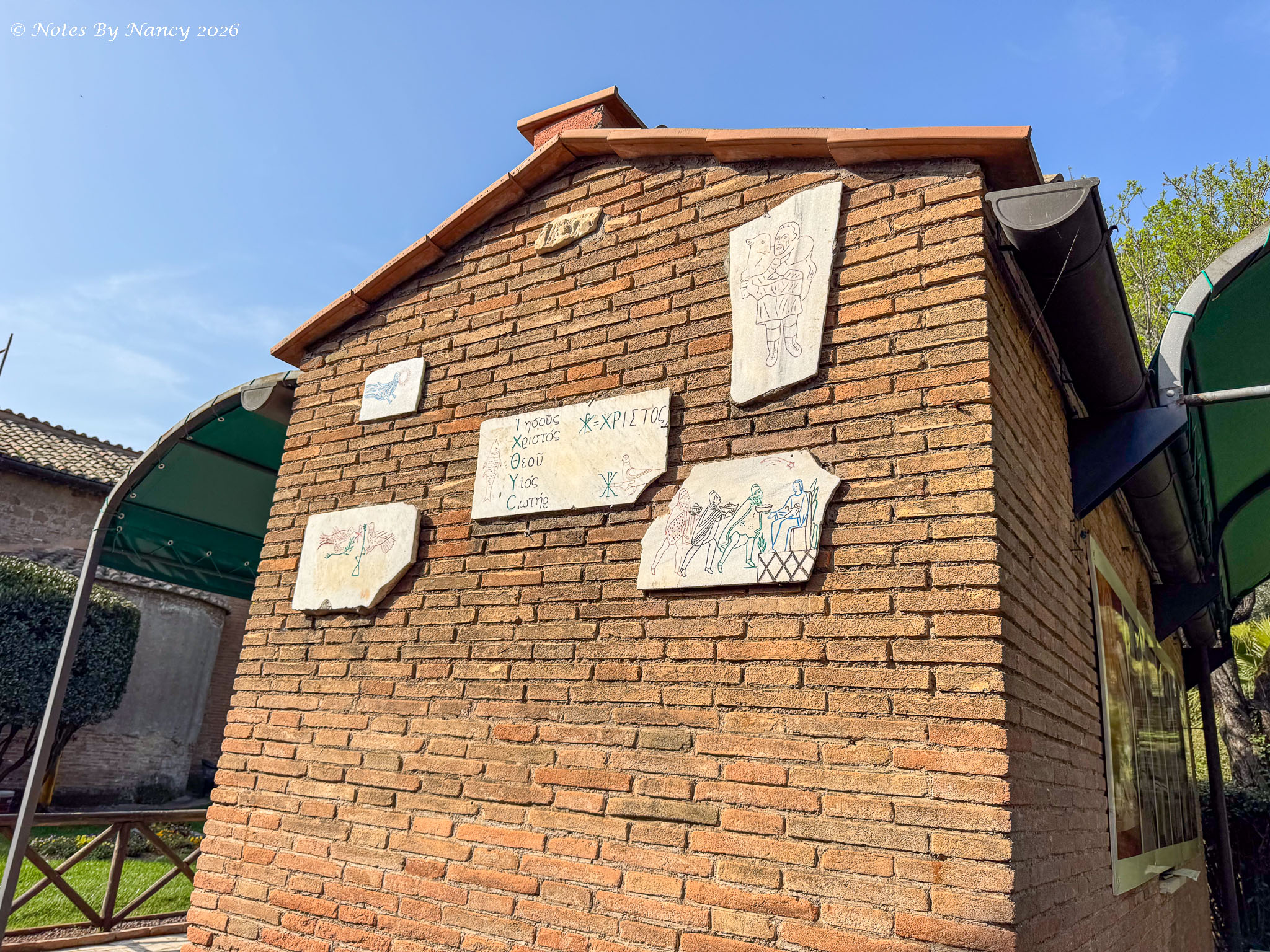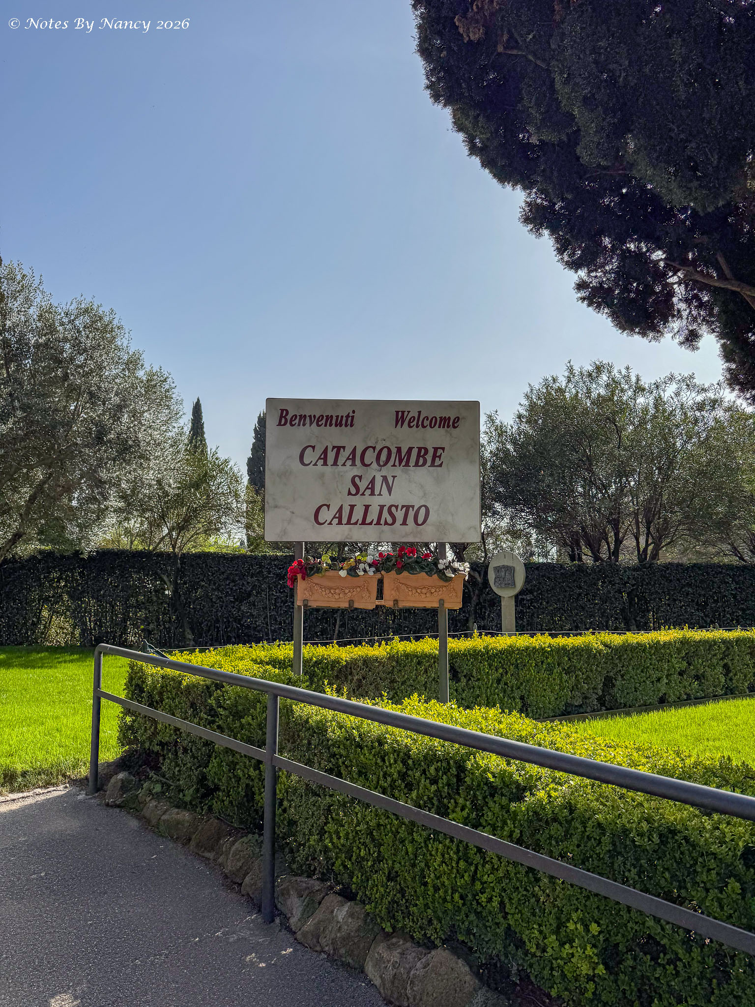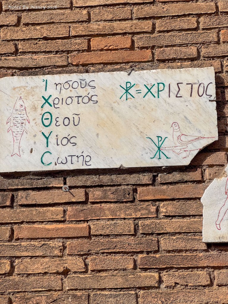 Our bus picked us up near Piazza Navona after our morning walk and lunch/free time (Note 126) and we drove outside the old city of Rome to the Catacombs of Saint Callixtus. I’d always thought the catacombs were under the streets – but apparently that is Paris and those are from the late 18th century. These originated in the mid-2nd century! Like all cemeteries during that time, they were located outside the cities for sanitary reasons. Originally for Christians and created from private land donations, this location came under the jurisdiction of the Catholic Church in the 3rd century following the Edict of Milan which ended religious persecution under Emperor Constantine’s rule. Over 500,000 Christians were buried underground here until the 5th century when the Church returned to above ground burials.