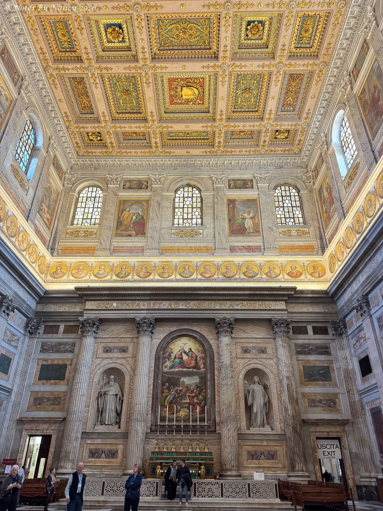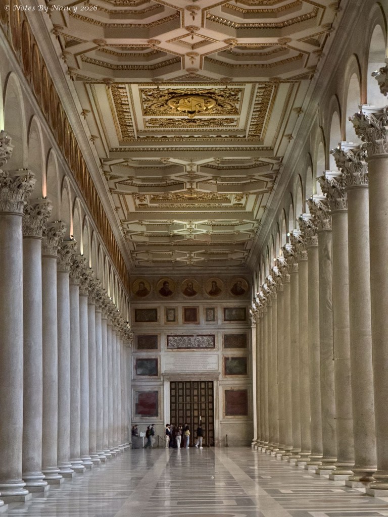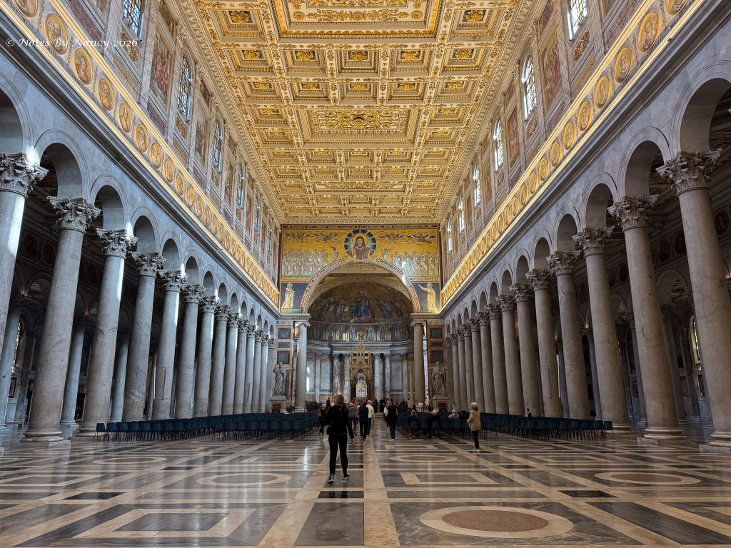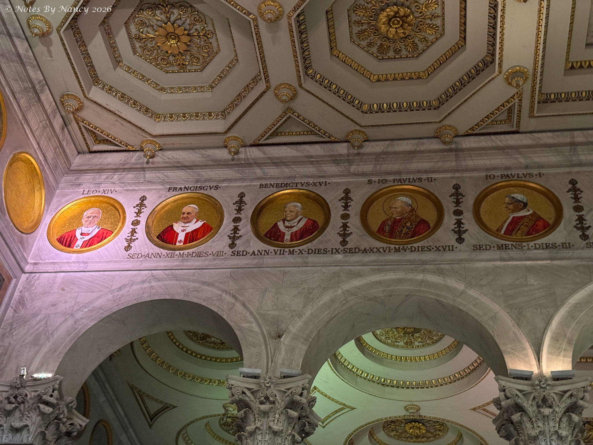 Along the sides of the nave are mosaic portraits of all 267 popes – seen in these images which include the ornate coffered ceilings and upper walls. Yes, that’s Leo XIV, the current pope, under the spotlight!