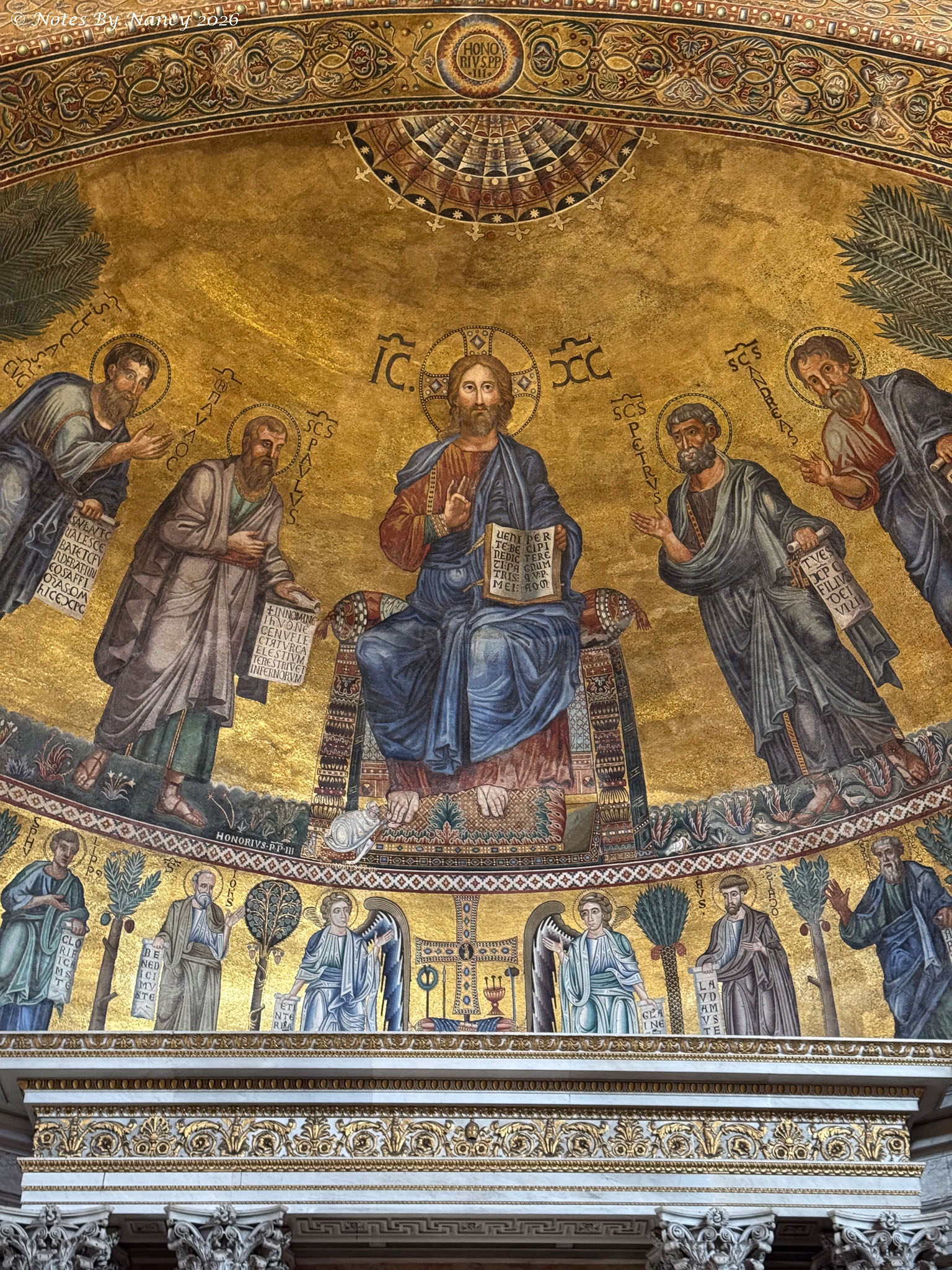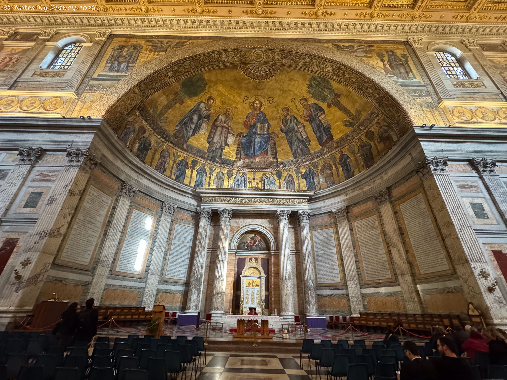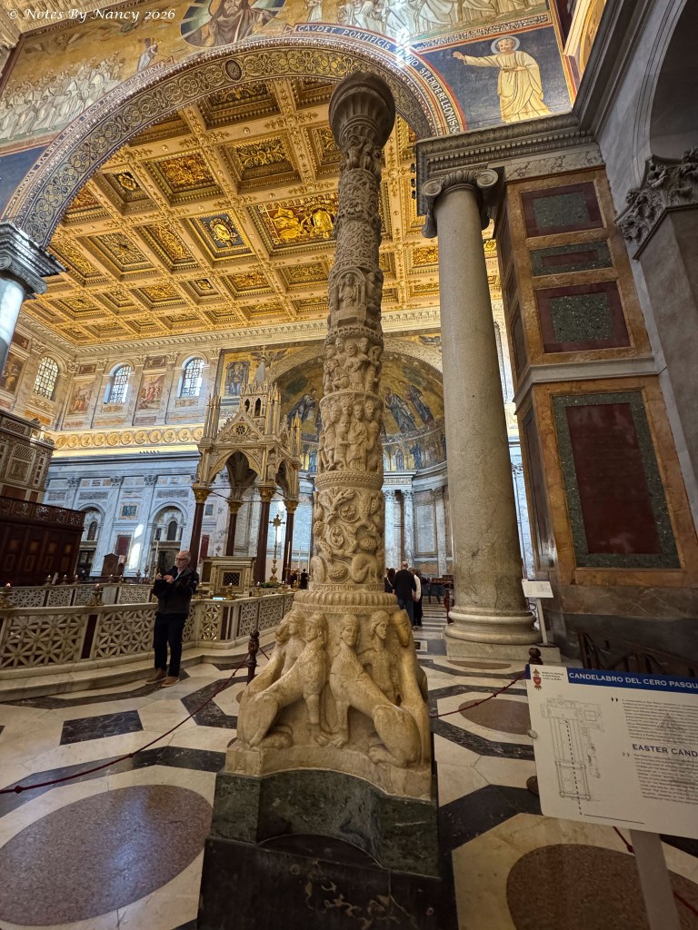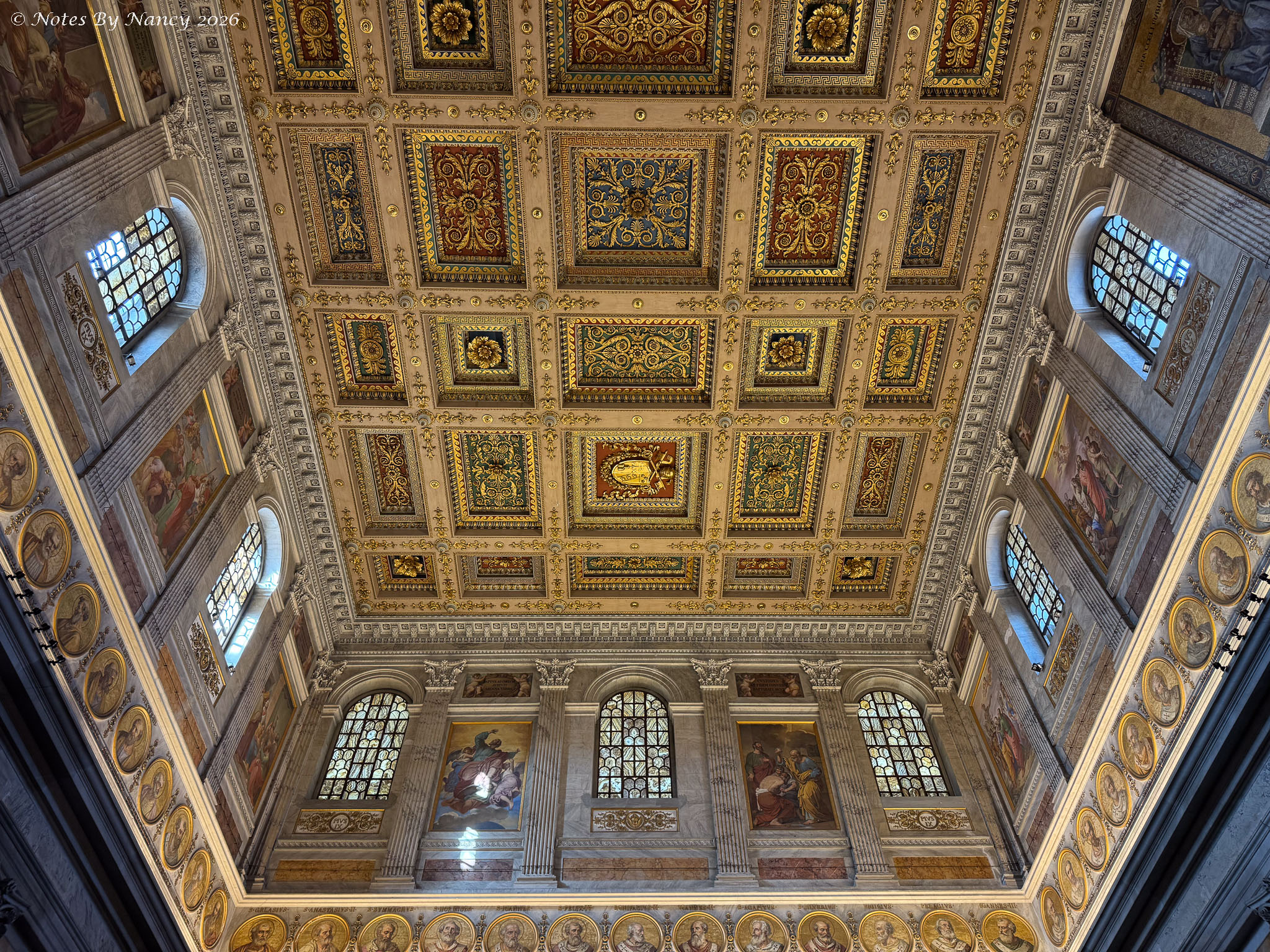 Along the sides of the nave are mosaic portraits of all 267 popes – seen in these images which include the ornate coffered ceilings and upper walls. Yes, that’s Leo XIV, the current pope, under the spotlight!