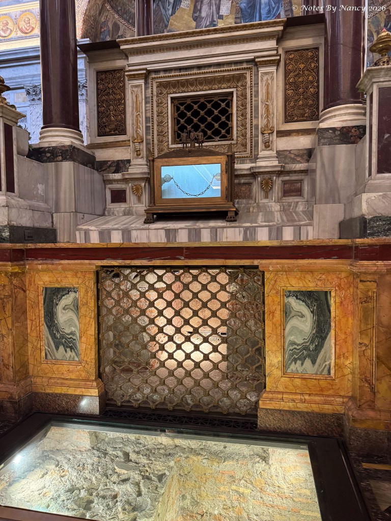 The window in the floor allows pilgrims to see the tomb of Paul. There is a railing all around and if you are undertall, like me, it is difficult to see much!