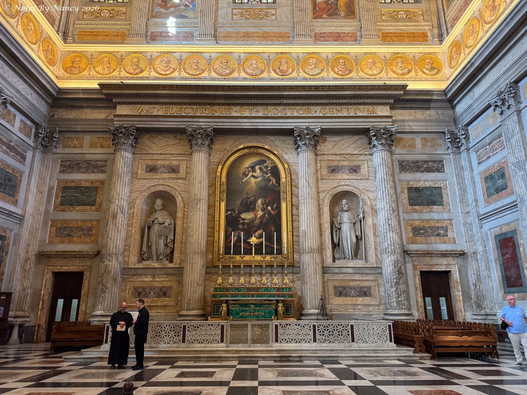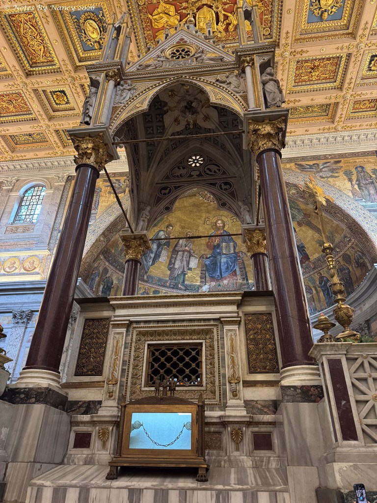 The canopy over the main altar is by Arnolfo di Cambio in 1285 and sits above the chains of Paul and above the site of Paul’s tomb. This magnificent structure survived the 1823 fire.